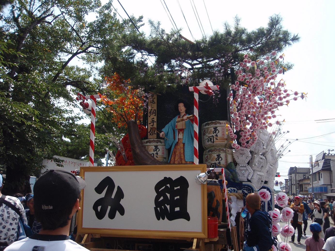 山車では、大蝦蟇の背に跨り妖術を使う児雷也を飾る。 |
