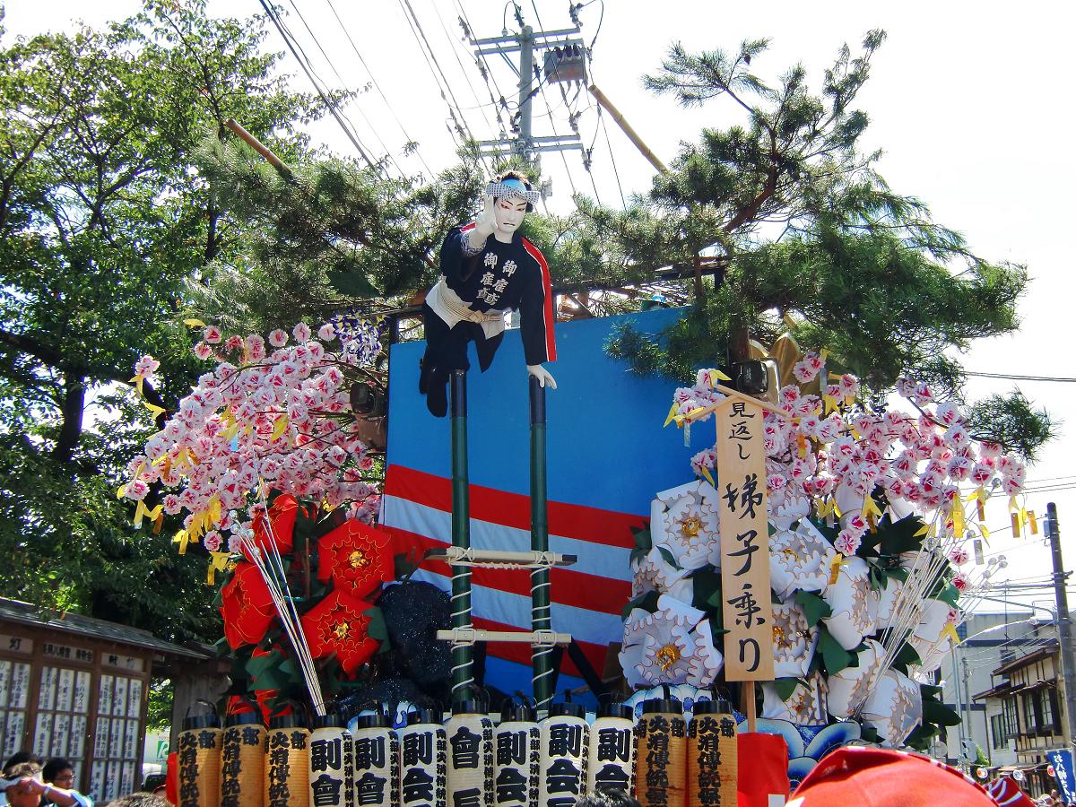 直立した梯子に乗り、上で曲芸をするこの梯子乗りには、 様々な演目があるが、この山車では、もっともポピュラーな 「義経八艘飛び」を飾る。 |