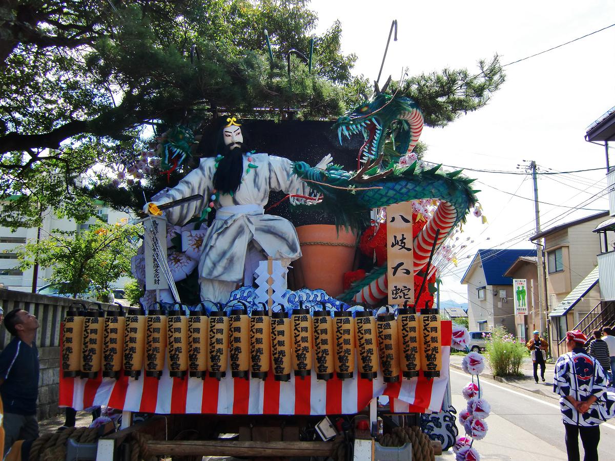 本年の山車では、荒神・スサノオノミコトと対峙する 大蛇の三つの頭を山車に再現している。