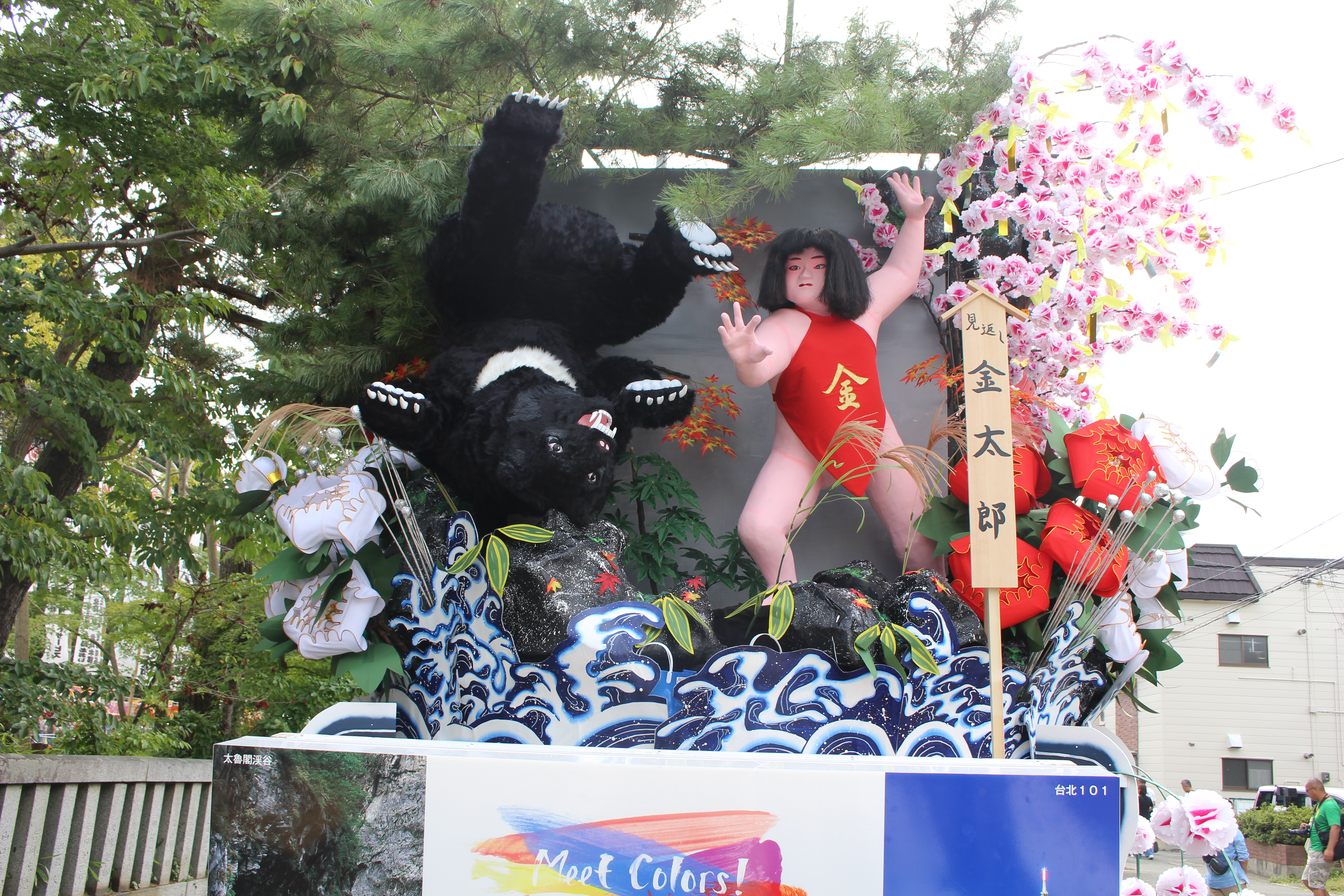 本年の山車では、足柄山で動物たちと相撲をとった童話から、 熊を軽々投げ飛ばす金太郎の姿を飾る。
